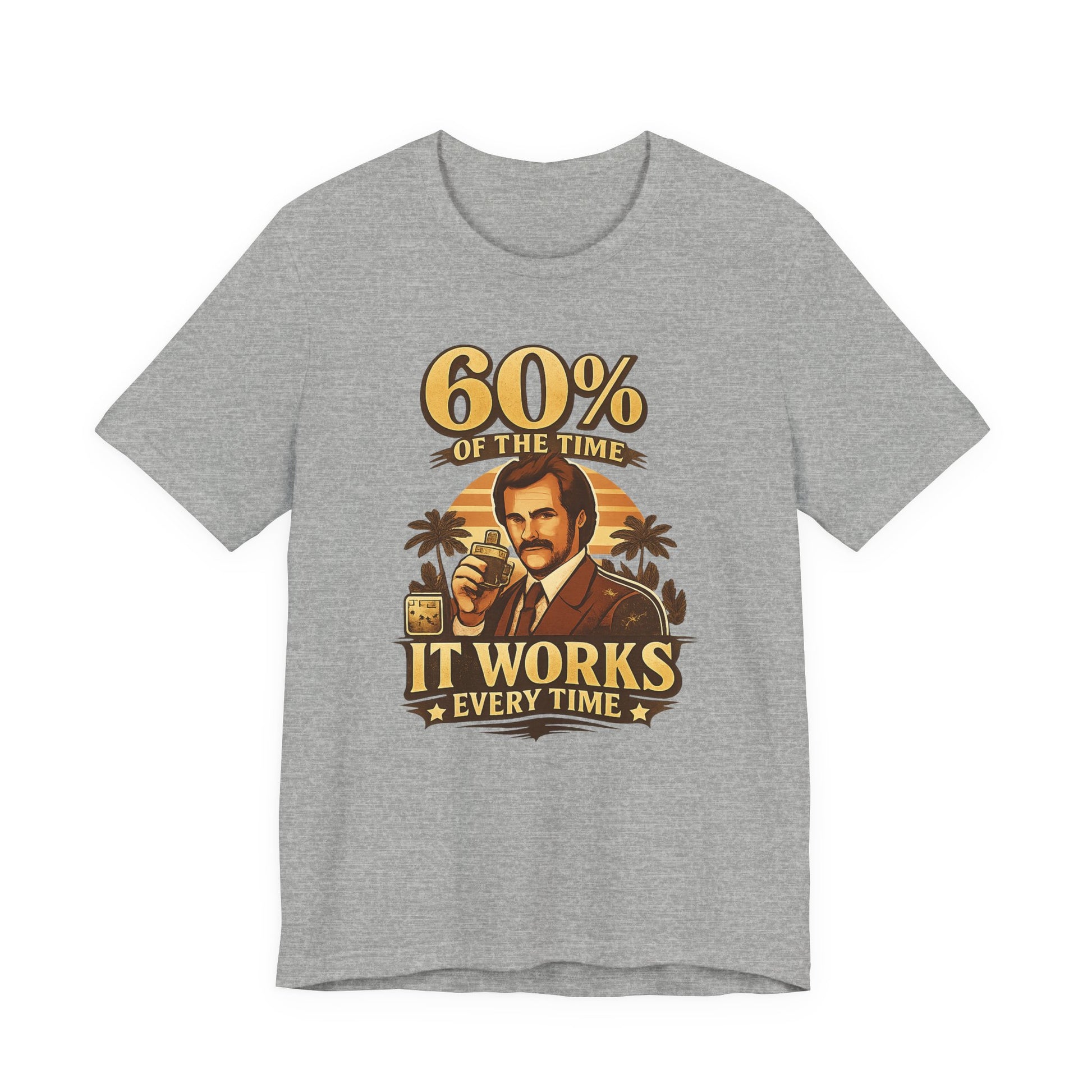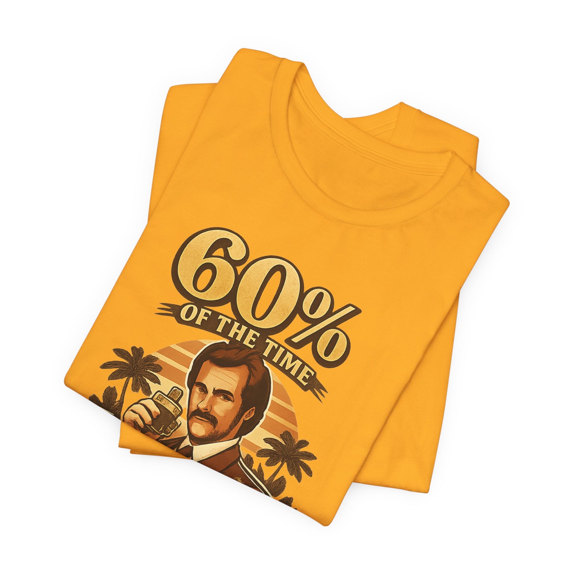 This vintage-inspired design captures the smooth-talking confidence of 1970s San Diego news anchor culture with warm earth tones and classic typography. Features the iconic "60% of the time, it works every time" quote in retro styling with period-appropriate mustache aesthetic and palm tree silhouettes.