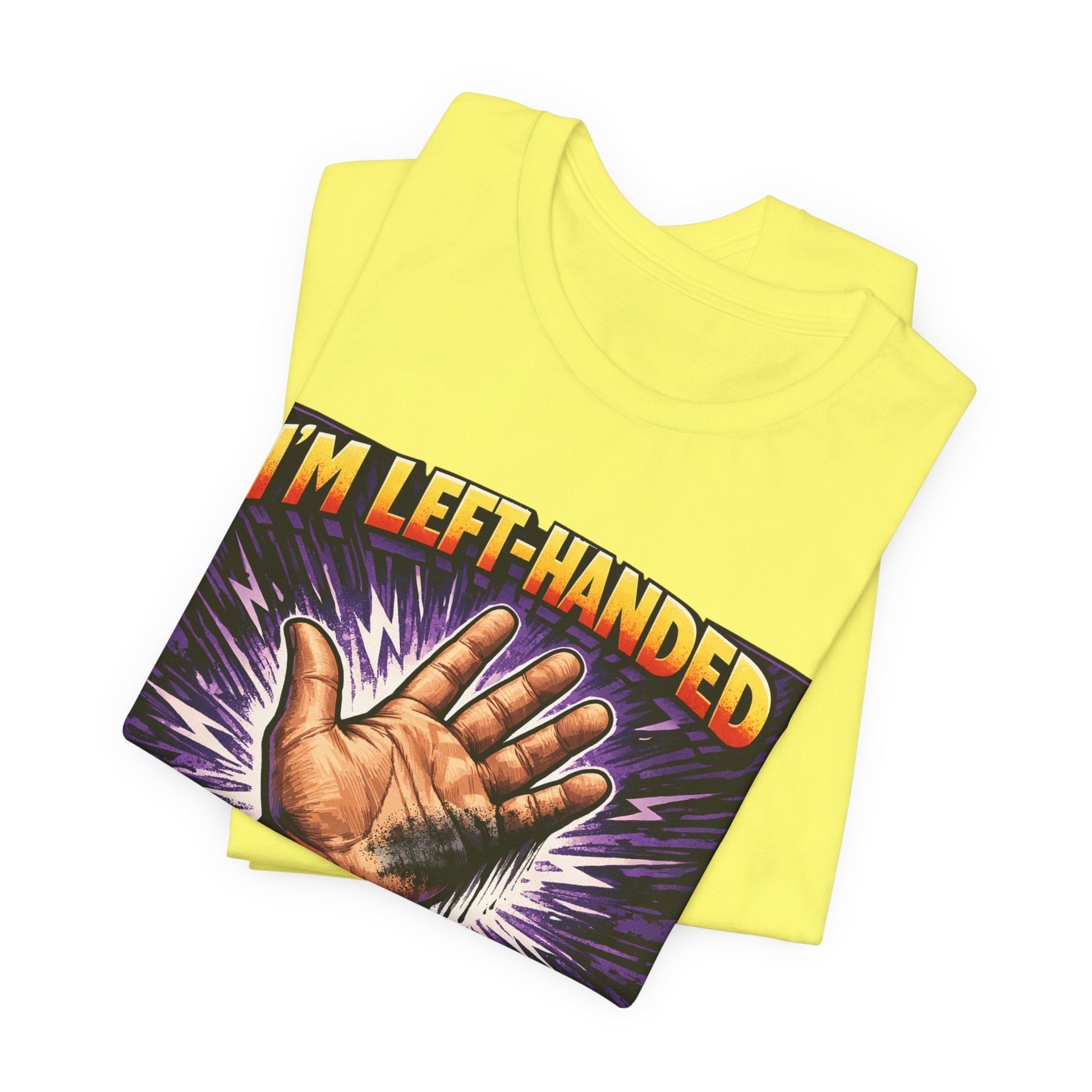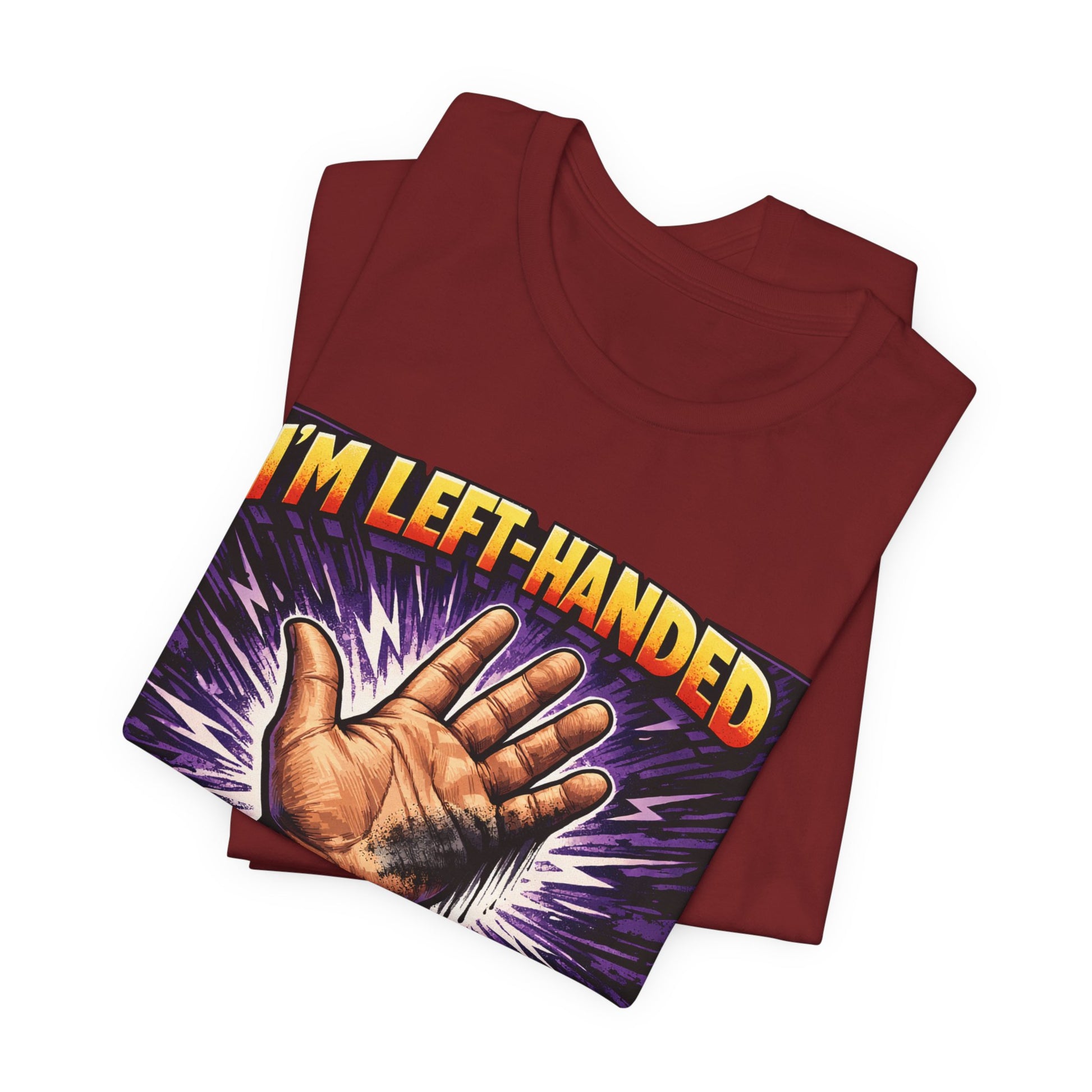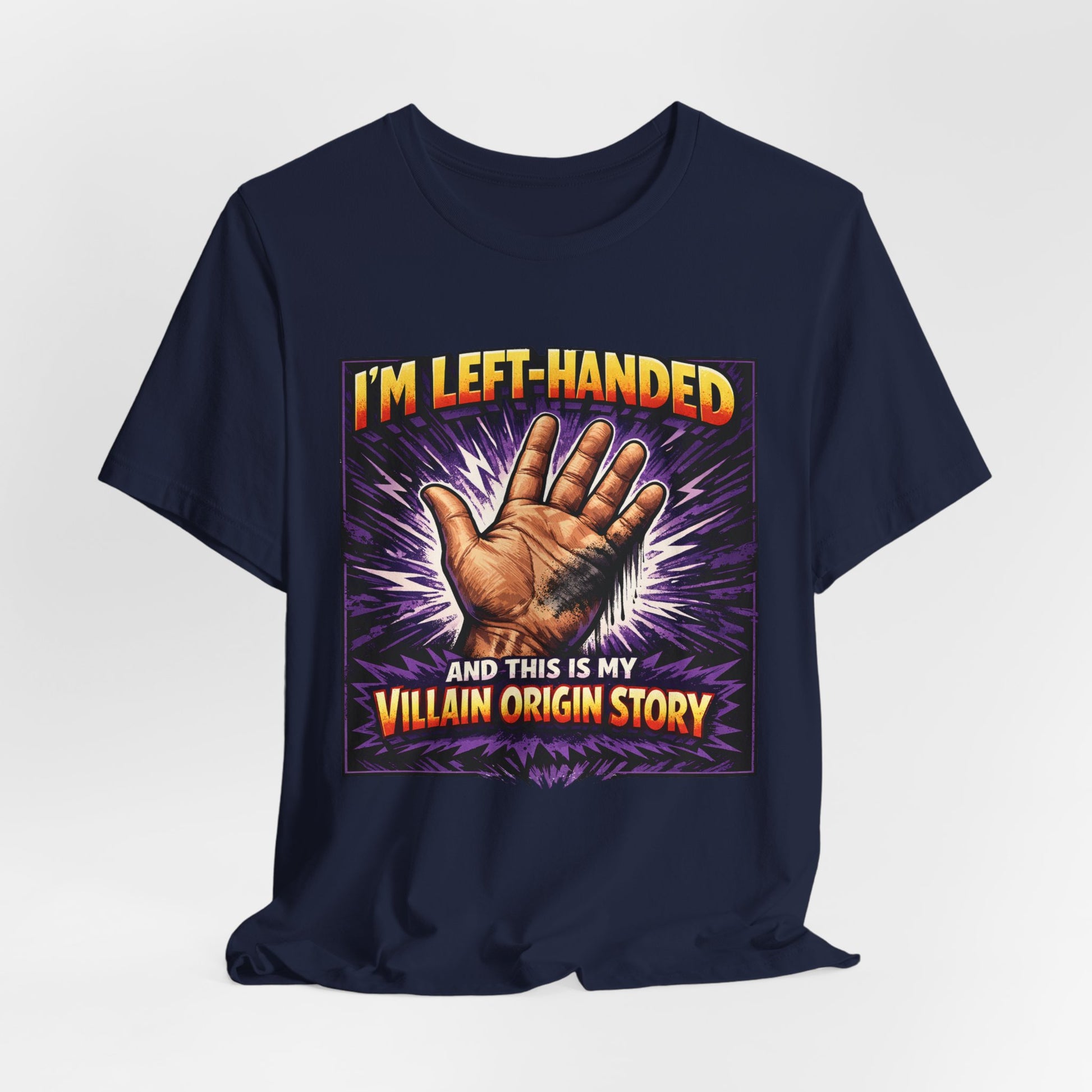 This comic book-inspired design features dramatic burst rays and bold lettering reminiscent of 1960s Marvel Comics covers, celebrating the quirky struggles of left-handed life. Perfect for southpaws who embrace their unique perspective and anyone who appreciates vintage superhero aesthetic with a humorous twist.