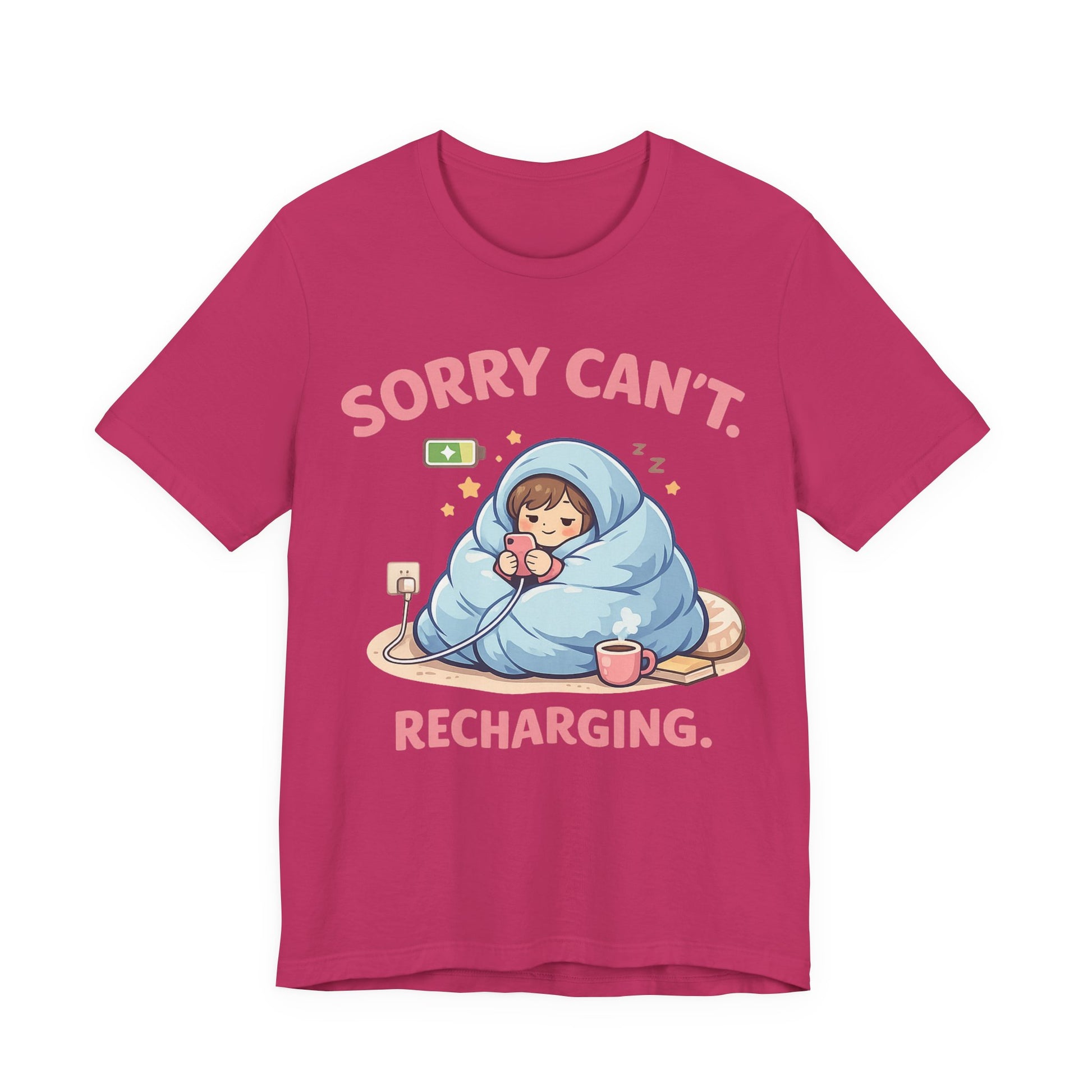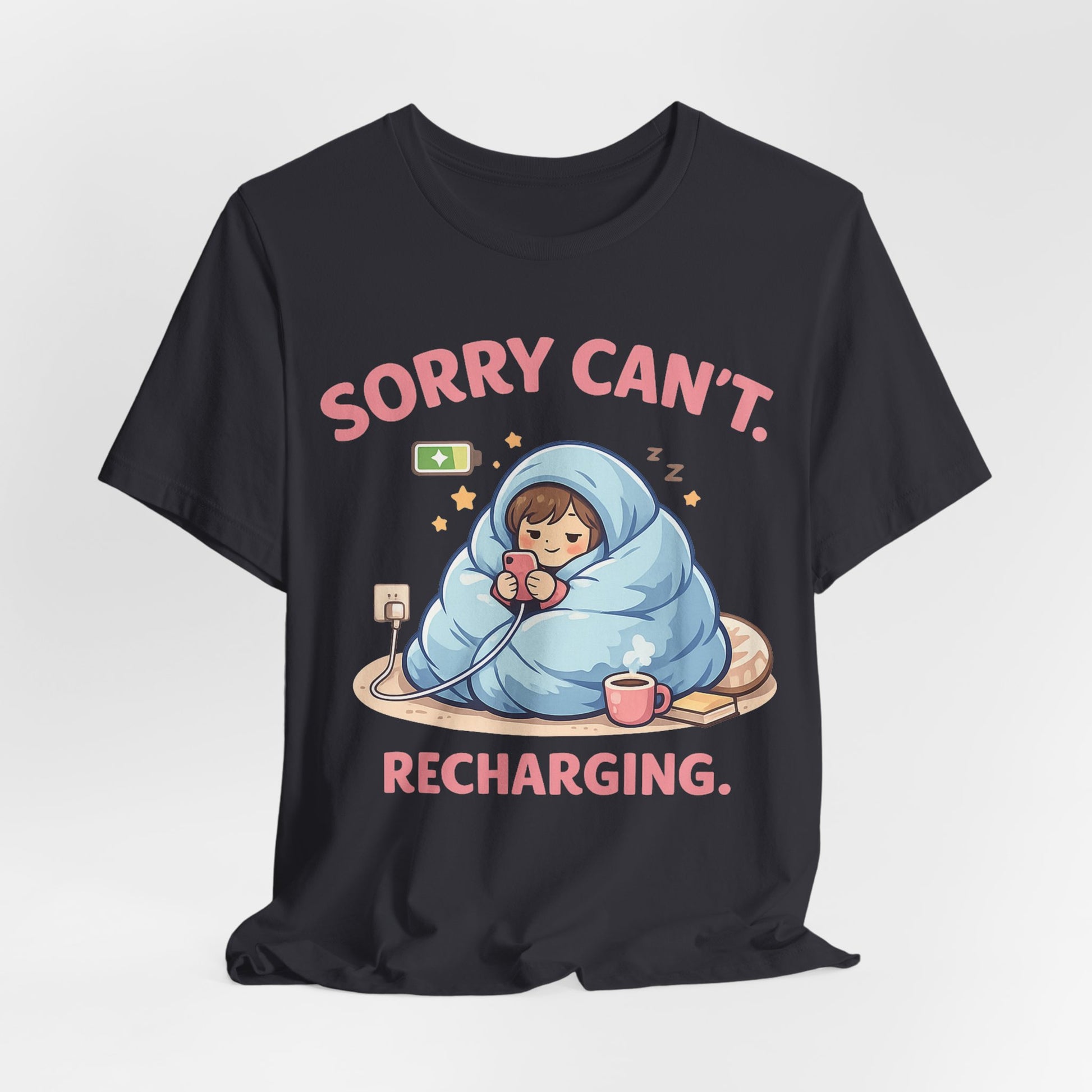 Embrace the cozy introvert lifestyle with this kawaii-inspired design featuring a tired character bundled in blankets with their phone charging. Perfect for millennials and Gen Z who understand the art of strategic social battery recharging and self-care hibernation sessions.