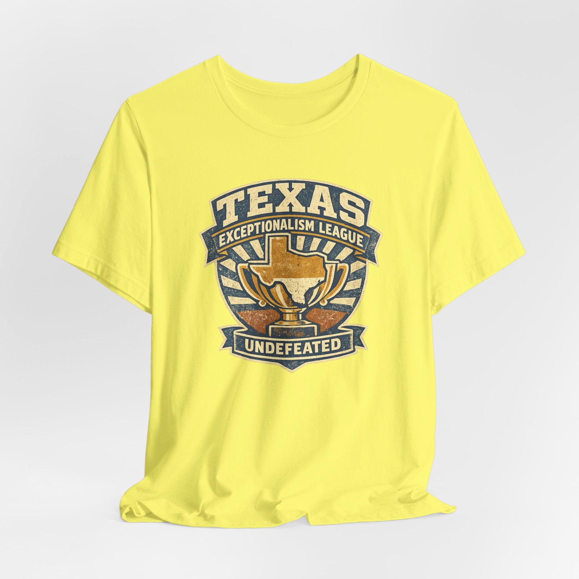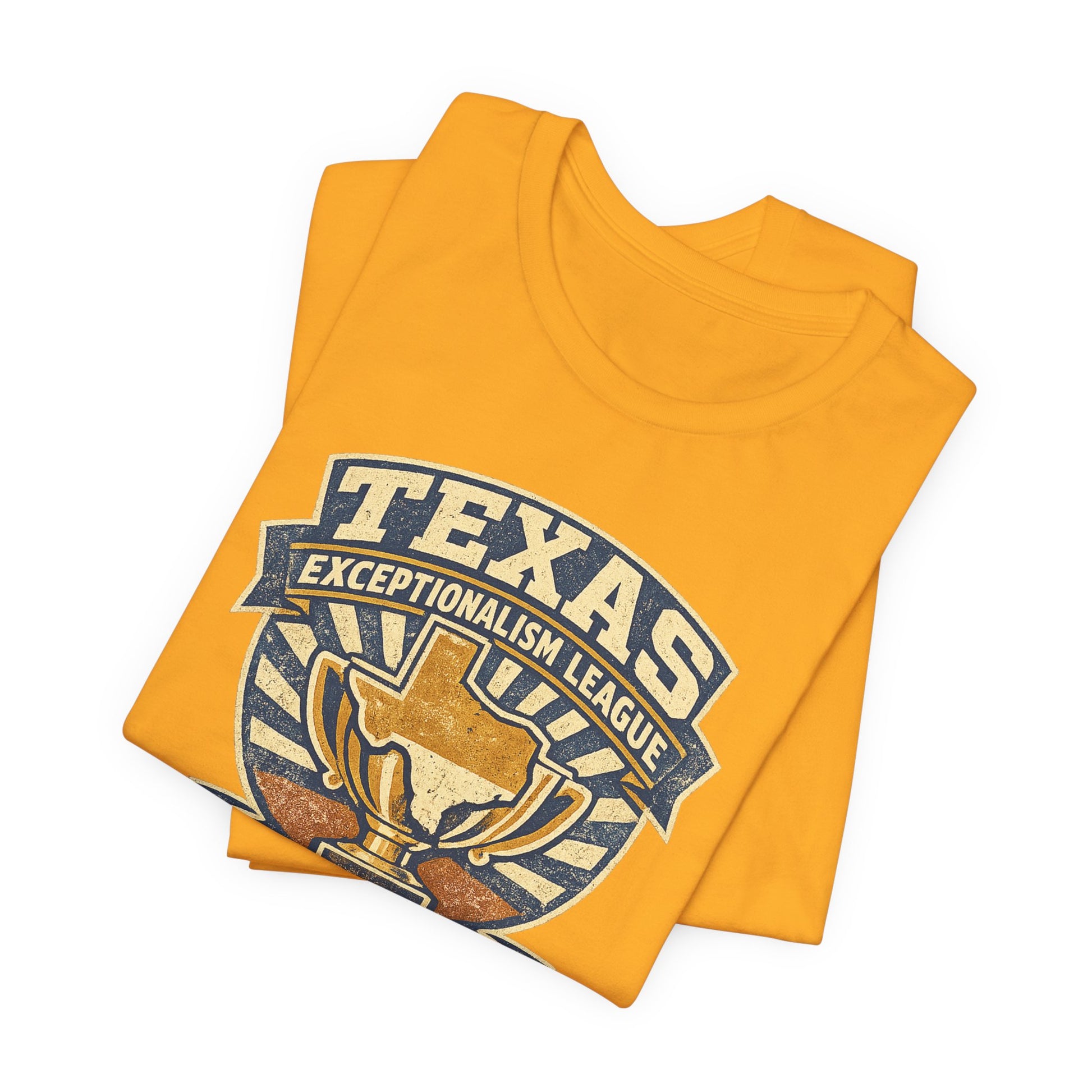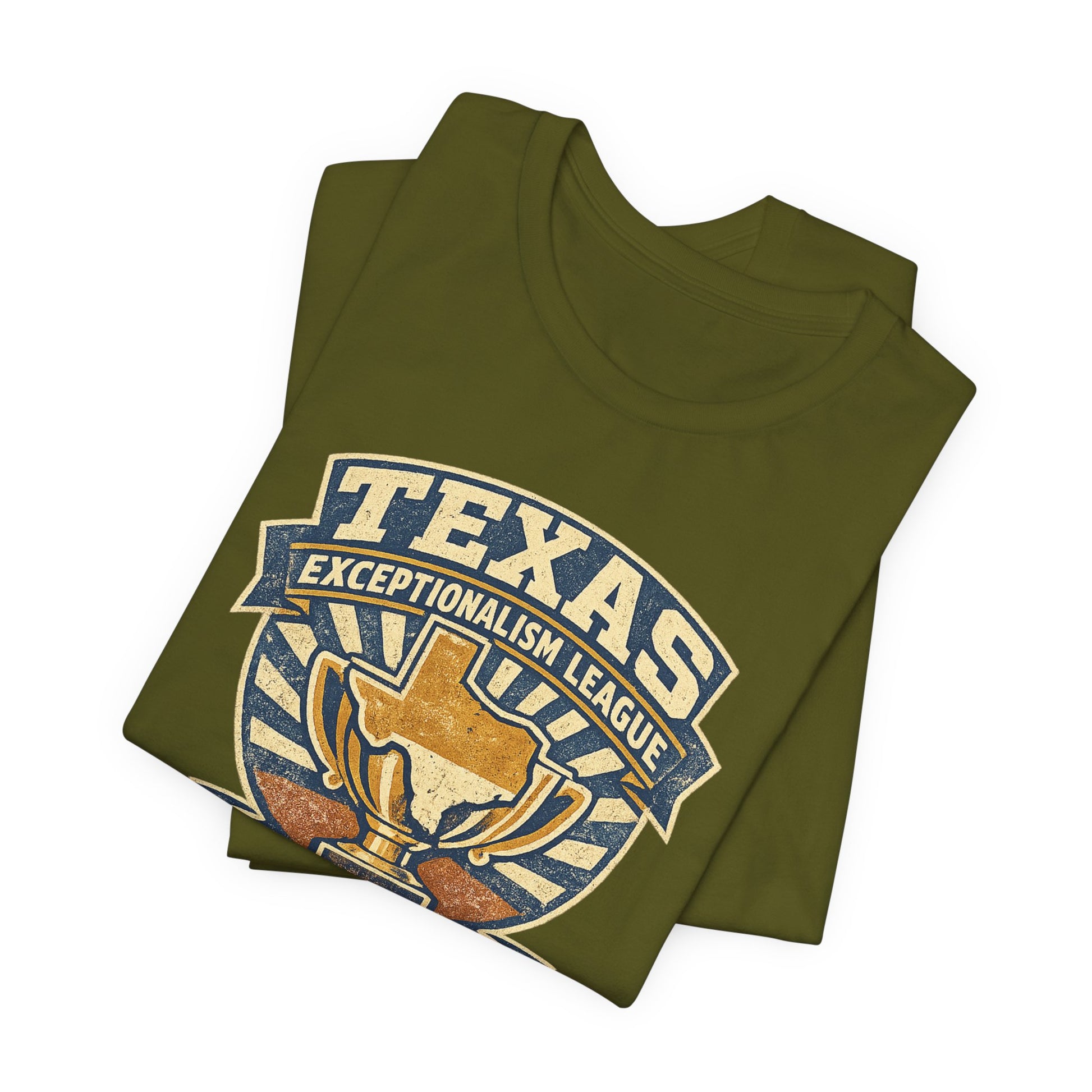 Satirical sports league logo celebrating Texas pride with tongue-in-cheek humor. Features vintage 1980s athletic badge design with Texas state outline as championship trophy, complete with weathered textures and classic collegiate lettering. Perfect for Texans who appreciate self-deprecating regional humor and vintage sports memorabilia aesthetic.