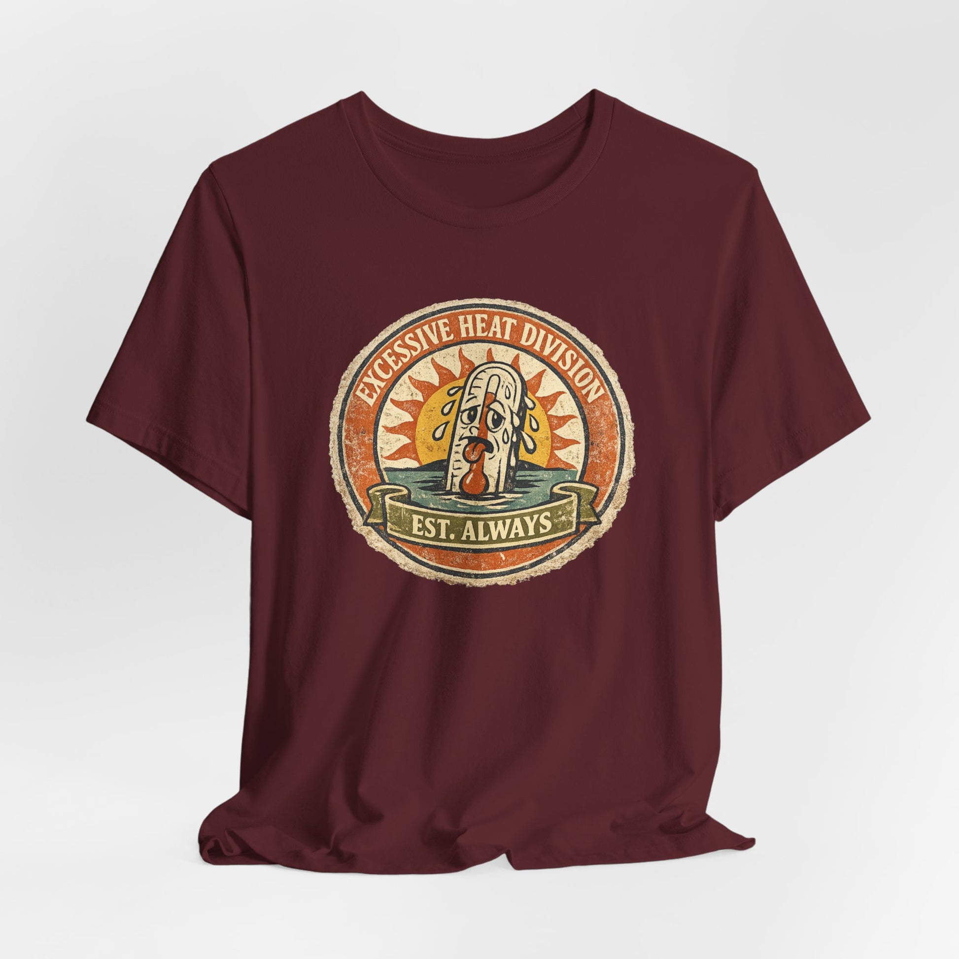 Government agency seal parody featuring an overheated thermometer mascot drowning in sweat. Inspired by 1970s federal department badges and the eternal struggle of surviving Texas summers. Perfect for Texas natives, heat wave survivors, and anyone who appreciates bureaucratic humor meets meteorological reality.