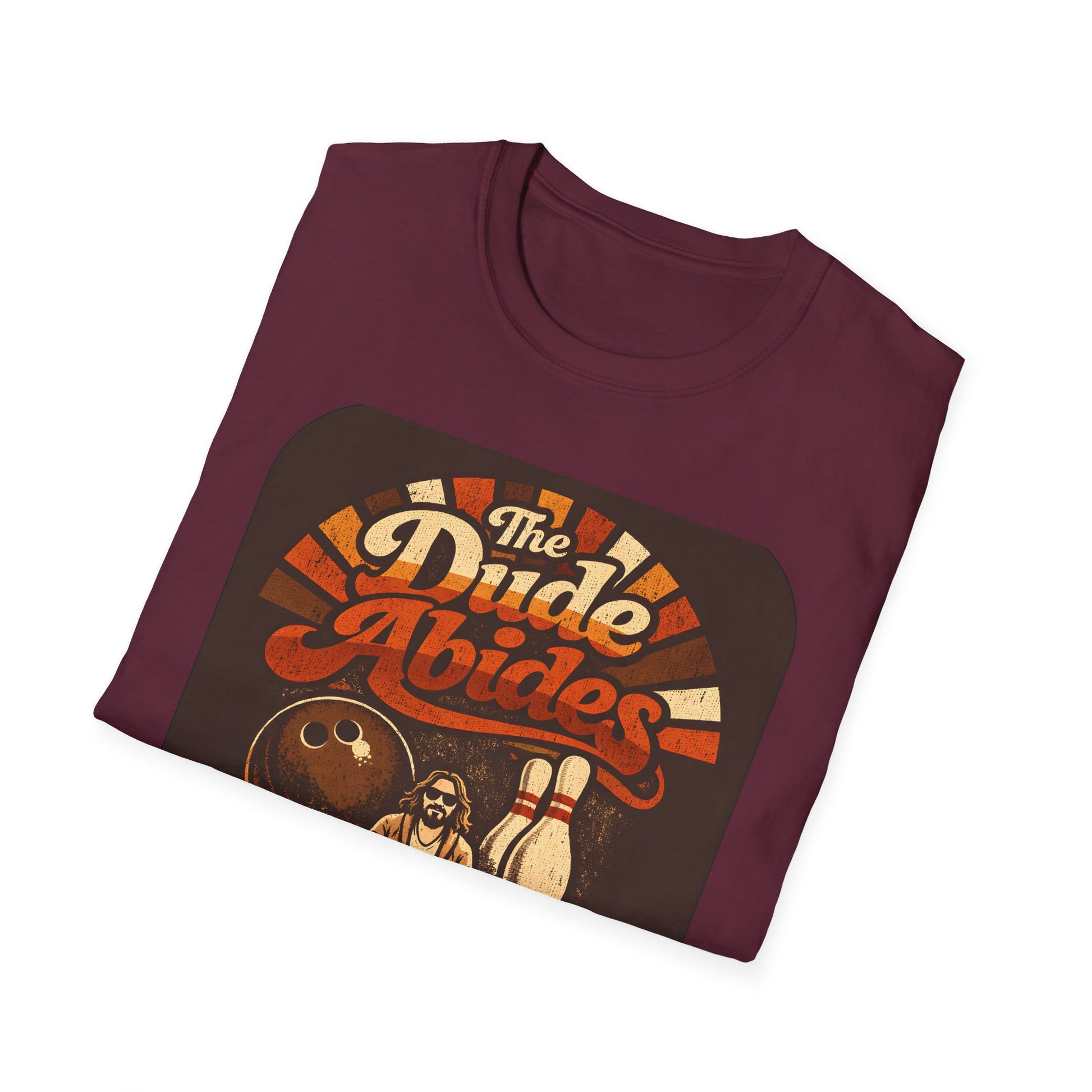 Vintage-inspired design featuring The Dude in meditation pose with bowling ball and pins. Perfect for Big Lebowski fans and bowling enthusiasts.
